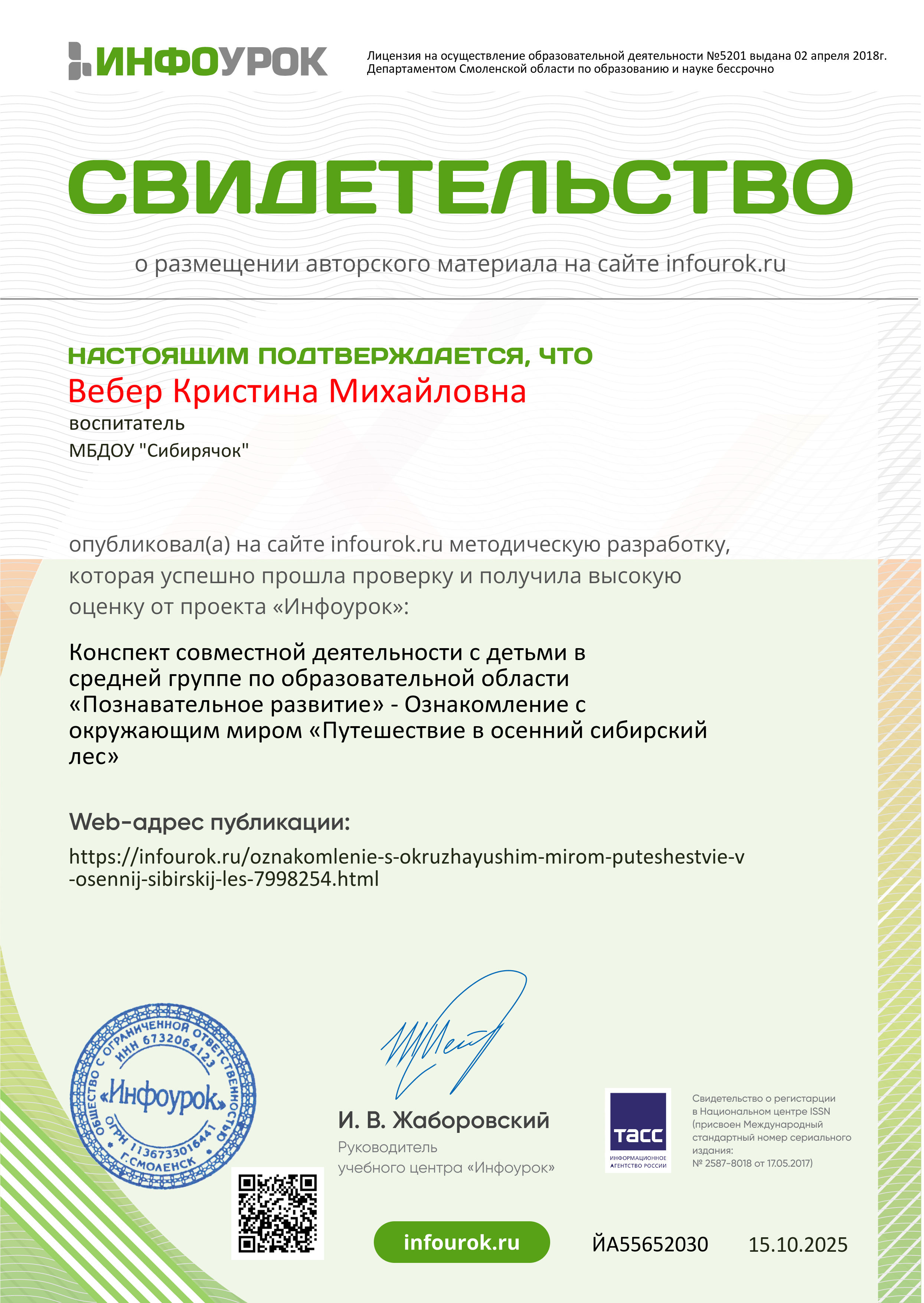 Свидетельство о размещении авторского материала на сайте infourok.ru:Конспект совместной деятельности с детьми в средней группе по образовательной области "Познавательное развитие"- Ознакомление с окружающим миром "Путешествие в осенний сибирский лес"