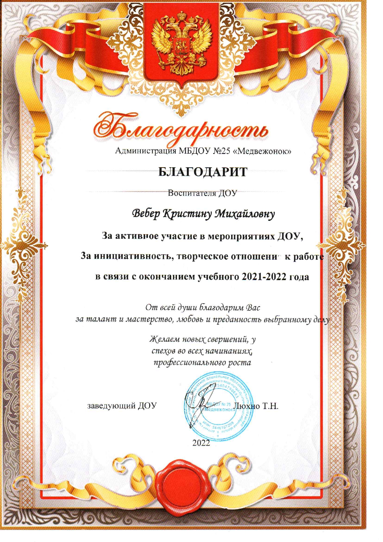 Благодарность за активное участие в мероприятиях ДОУ, за инициативность, творческое отношение к работе в связи с окончанием учебного года 2021-2022г