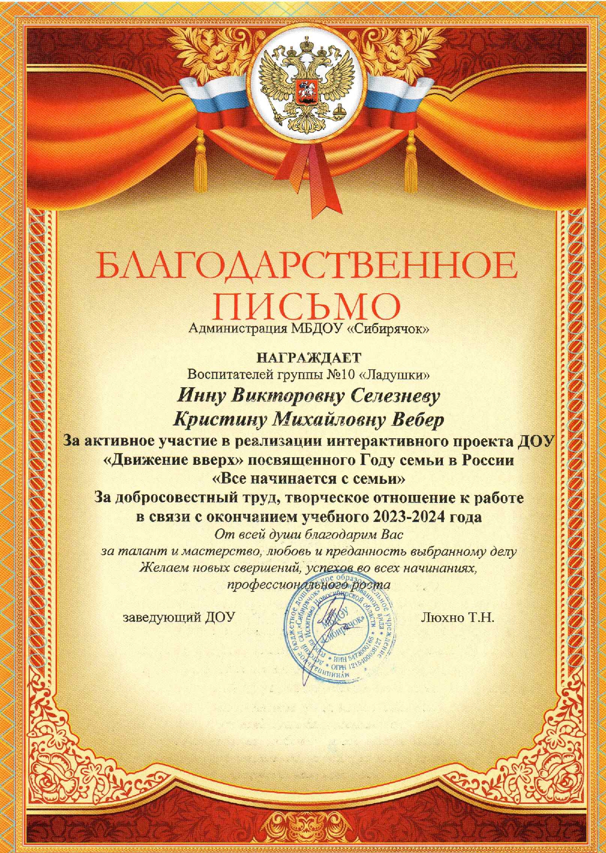 за активное участие в реализации интерактивного проекта ДОУ "Движение ВВЕРХ" посвященного Году семьи в России "Все начинается с семьи", за добросовестный труд, творческое отношение к работе в связи с окончанием учебного 2023-2024 года