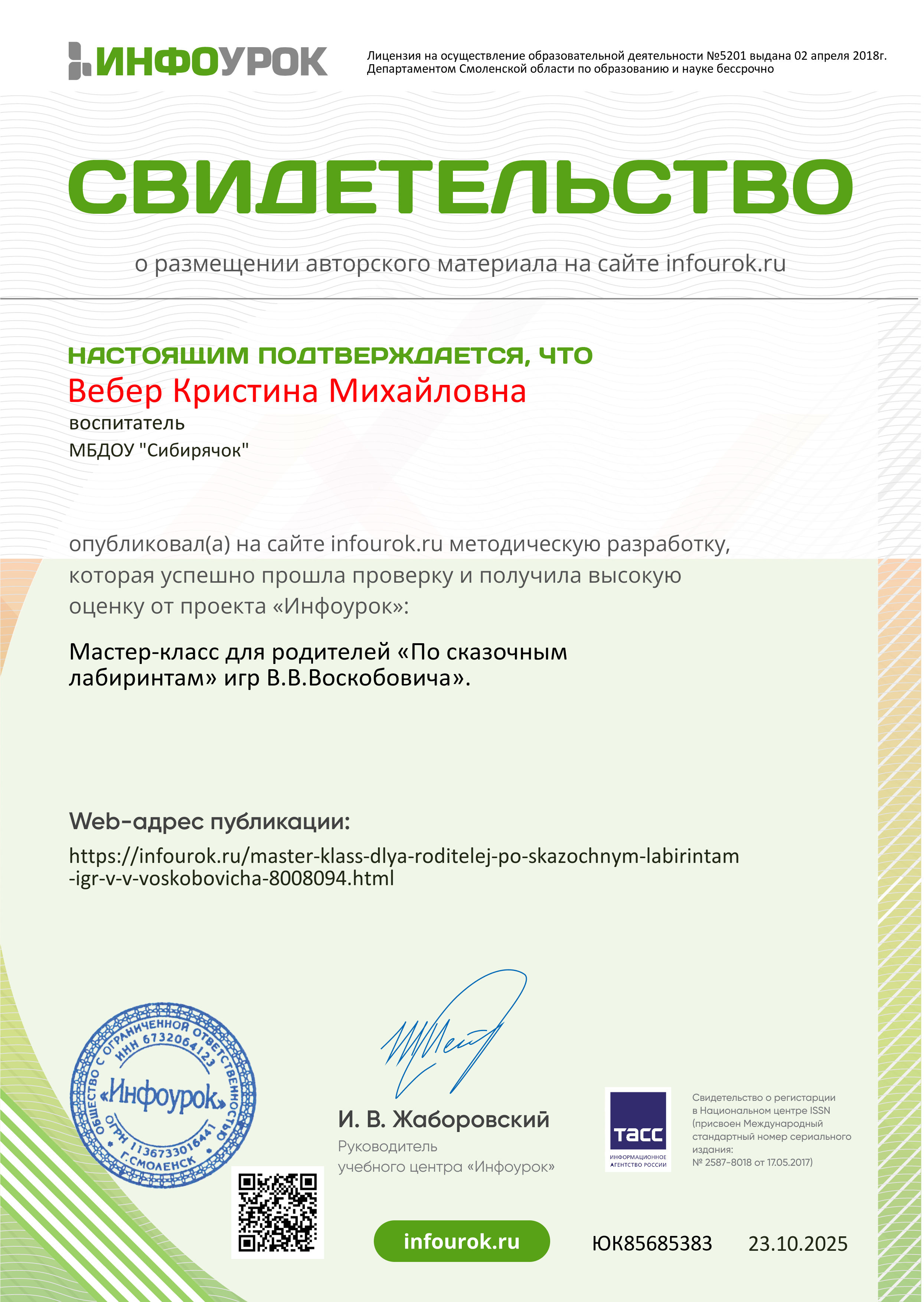 Свидетельство о размещении авторского материала на сайте infourok.ru: Мастер-класс для родителей "По сказочным лабиринтам" игр В.В. Воскобовича