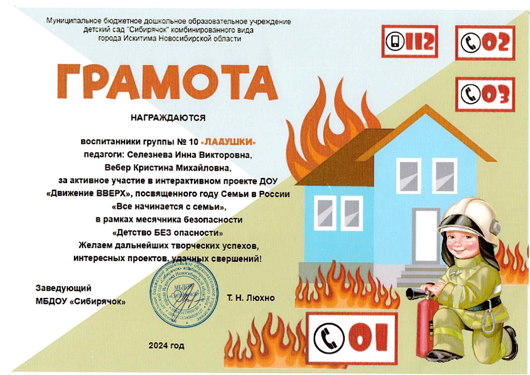 Грамота педагогов и воспитанников, за участие в интерактивном проекте ДОУ "Движение ВВЕРХ", посвященному году Семьи в России "Все начинается с семьи", в рамках месячника безопасности "Детство без опасности" 2024 год