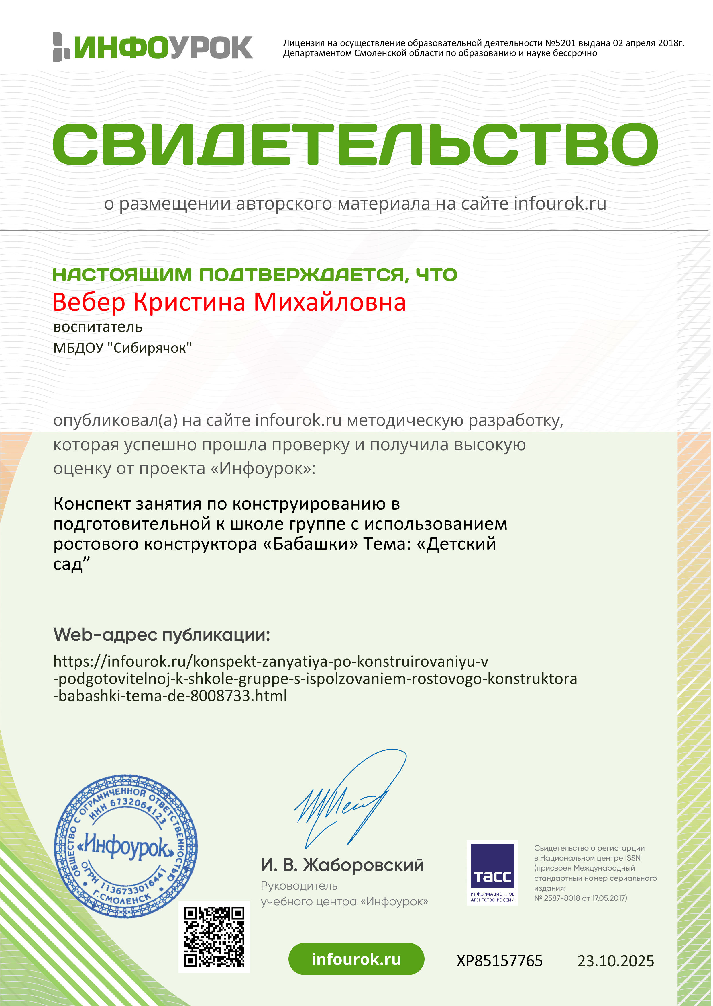 Свидетельство о размещении авторского материала на сайте infourok.ru:Конспект занятия по конструированию в подготовительной к школе группе с использованием ростового конструктора "Бабашки"- "Детский сад"